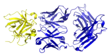 مخطط لكاناكينوماب (باللون الأزرق) يرتبط إنترلوكين 1 بيتا (باللون الأصفر)، مصدر الصورة هو PDB المدخل 5bvp[1]