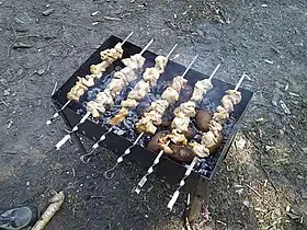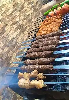 - شيش كباب وهو قطع لحم مكعبة ترص عل السيخ وتُشوى على الفحم . يمكن إضافة الخضار مثل البصل أو الفلفل الرومي أو الكوسة. وفي سوريا وفلسطين (توضيح) يُضاف قطع الدهن من ذنب الخروف (اللّية).