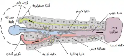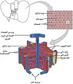 مجهرياً، يتكون كل فص كبدي من فصيصات كبدية. الفصيصات سداسية الشكل تقريباً، تتكون من صفائح من الخلايا الكبدية تتشعع حول وريد مركزي.[22] ينضم الوريد المركزي إلى الوريد الكبدي لحمل الدم من الكبد.