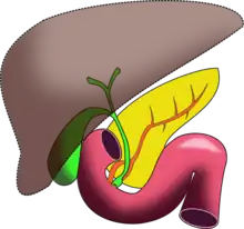 الكبد هو عبارة عن غدة هضمية ملحقة تنتج الصفراء (مركب قلوي يساعد في تحطيم الدهون). تساعد الصفراء في عملية الهضم عن طريق استحلاب الشحوم. تُخزن الصفراء التي ينتجها الكبد في المرارة -كيس صغير يتوضع تحت الكبد- ثم تنتقل الصفراء إلى الأمعاء الدقيقة لاستكمال عملية الهضم.[5]