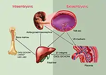 في الجنين، لا يقوم الكبد بإجراء العمليات الهضمية الطبيعية والترشيح التي يقوم بها كبد الرضيع لأنه يتلقى المغذيات مباشرة من الأم عبر المشيمة. يطلق كبد الجنين بعض الخلايا الجذعية الدموية التي تهاجر إلى الغدة الصعترية الجنينية، مكونةً الخلايا التائية أو الخلايا اللمفاوية التائية (T-lymphocytes). بعد الولادة، يتحول تشكيل الخلايا الجذعية للدم إلى نخاع العظم الأحمر.