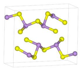 - تكون لبلورات كبريتيد الزرنيخ بنية بوليميرية تتألف وحداتها من مركز من ذرة زرنيخ محاطة بثلاث ذرات من الكبريت على شكل هرم ثلاثي [الإنجليزية]، بالمقابل فإن كل ذرة كبريت ترتبط بذرتي زرنيخ. في الشكل البلوري لكبريتيد الزرنيخ تشكل الروابط As-S طبقات صفائحية مرتبطة مع بعضها البعض بقوى فان دير فالس.[5] بالنسبة للشكل اللابلوري فإنه يكون متشابكاً لا على شكل صفائح، وتكون له القدرة على تشكيل طور زجاجي.
