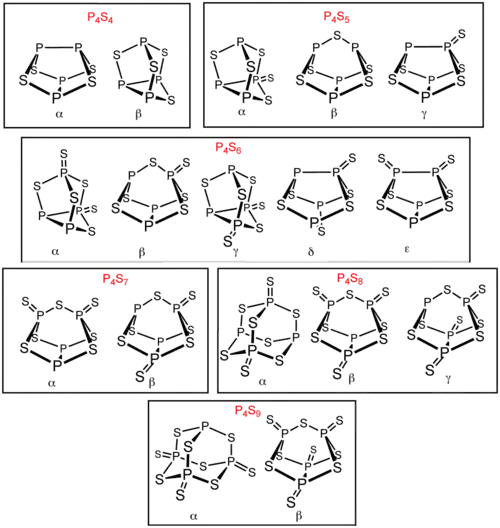 هناك مركبان ذوا أهمية من بين هذه المركبات، وهما خماسي كبريتيد الفوسفور (P4S10) وثلاثي كبريتيد رباعي الفوسفور (P4S3). من بين الكبريتيدات الممكنة أيضاً كل من P4S4 و P4S5 و P4S6 و P4S7 و P4S8 و P4S9. يستخدم للتمييز بينها أحرف إغريقية، والتي هي مرتبة حسب تاريخ الاكتشاف، وليس اعتماداً على البنية.[2] يعد P4S2 معروفاً أيضاً، لكنه غير مستقر فوق درجة الحرارة −30 °C.[3]