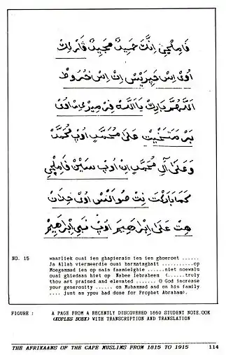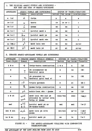 - …Stell, Gerald. From Kitaab-Hollandsch to Kitaab-Afrikaans: The evolution of a non-white literary variety at the Cape نسخة محفوظة 1 يونيو 2011 على موقع واي باك مشين. "نسخة مؤرشفة" (PDF). Archived from the original on 6 يناير 2012. اطلع عليه بتاريخ 22 سبتمبر 2020. الوسيط