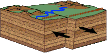 نظرًا لأن معظم الضغوط تتعلق بالنشاط التكتوني للصفائح المتحركة، فإن معظم الحركة بين الكتل تكون أفقية، موازية لقشرة الأرض عن طريق صدع الانزلاق . لكن الحركة العمودية للكتل تنتج نتائج أكثر دراماتيكية. في بعض الأحيان يتم تشكيل التضاريس (الجبال ، التلال ، التلال ، البحيرات ، الوديان ، إلخ) عندما يكون للصدوع إزاحة رأسية كبيرة. يمكن أن تشكل الكتل المرتفعة المجاورة جرفًا مرتفعًا. غالبًا ما تكون حركة هذه الكتل مصحوبة بإمالة، بسبب الضغط أو تمدد القشرة عند هذه النقطة.