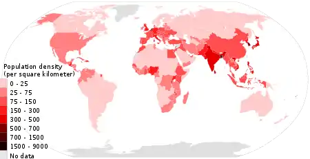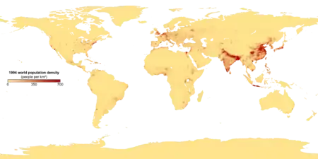 عدد سكان العالم هو 7.5 مليار نسمة، ومساحة الأرض الكلية (بما في ذلك الأرض والمياه) هو 510 ملايين كيلو متر مربع (197 مليون ميل مربع)، وعلى ذلك فإن الكثافة السكانية البشرية في جميع أنحاء العالم هي 7.5 مليار ÷ 510 مليون = 14.7 شخص لكل كيلومتر مربع (38 شخص لكل ميل مربع). أما إذا كنا نريد حساب الكثافة السكانية تبعاً لمساحة الأرض فقط فهي كالتالي: مساحة اليابسة 150 مليون كيلومتر مربع (58 مليون متر مربع ميل) وعليه فإن الكثافة السكانية للبشر سترتفع إلى 50 شخص لكل كيلومتر مربع (129 شخص للميل المربع الواحد)، هذا الحساب يشمل جميع مساحات القارات والجزر بما في ذلك القارة القطبية الجنوبية، أما إذا تم استبعادها القارة القطبية الجنوبية، فإن الكثافة السكانية سترتفع إلى 55 شخص لكل كيلومتر مربع (ما يزيد عن 142 شخص للميل المربع الواحد)، وبالنظر إلى أن أكثر من نصف مساحة الأرض تتألف من مناطق وعرة يصعب عليها الاستيطان البشري كالصحاري والجبال العالية وأغلب التجمعات البشرية تميل إلى التجمع حول الموانئ البحرية ومصادر المياه العذبة، فإن هذا التعدد في حد ذاته لا يعطي أي قياس ذو مغزى للكثافة السكانية.
