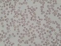 ![]() تشويه الدم المحيطي من المريض المصاب بالكثرة الكريات الحمر تشويه الدم المحيطي من المريض المصاب بالكثرة الكريات الحمر | |