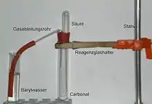 ويمرر ثاني أكسيد الكربون الناشيء في ماء الجير أو ماء الباريت حيث يحدث تعكيرا أبيض اللون للماء من كربونات الكالسيوم كاربونات أو كربونات الباريوم.