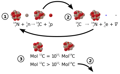 أعلى معدل تكوين الكربون-14 يحدث على ارتفاع 9 إلى 15 كيلومتر ، ثم ينتشر في جميع أنحاء الأرض ويتفاعل مع الأكسجين مكونا ثاني أكسيد الكربون مشع. ويذوب ثاني أكسيد الكربون في الماء وينتشر في المحيطات .