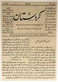 كردستان كانت أول صحيفة كردية. لقد نُشرت لأول مرة في 22 أبريل 1898 في القاهرة في مصر بواسطة مقداد مدهاد بادرهان، عضو في جمعية صعود كردستان. وخلال أربع سنوات، تم طباعة 31 إصدارًا في مدن مثل القاهرة وجنيف ولندن وفولكستون. لقد كانت صحيفة معارضة نشرت في المنفى (خارج الدولة العثمانية) وبدعم من جمعية الاتحاد والترقي.[1] تم حظر الصحيفة في الإمبراطورية العثمانية وكان لا بد من تهريبها. ووفقًا للرسائل الموجهة إلى المحرر، كان لها قراء في مدن مثل أضنة ودمشق وماردين وديار بكر.[2] نُشرت مقالات تتعلق بمعارضة السلطان عبد الحميد الثاني والتاريخ والأدب الكردي.[3] وفي عام 1991، قام الباحث أمين بوزارسلان بإعادة نشر وترجمة مجموعة من إصداراته إلى اللغة التركية الحديثة.[4]