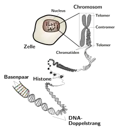 الكروموسوم كلمة يونانية تعني الجسم الملون ولكل كروماتيد في الكروموسوم الواحد ذراعان أحدهما طويل والأخر قصير، تم ملاحظة الكروموسوم لأول مرة في خلايا النباتات من قبل عالم نبات سويسري اسمه كارل ولهيلم Karl Wilhelm في عام 1842. وتختلف الخلايا في الكائنات الحية في عدد الكروموسومات الموجودة فيه. ففي كل خلية جسمية في الأنسان يوجد 46 كروموسوما، أما في القرد فهناك 48 كروموسوما في كل خلية جسمية. ولا يعتمد عدد الكروموسومات على حجم الكائن الحي، فالفيل مثلا عنده 56 كروموسوما في كل خلية جسمية بينما تمتلك الفراشة 380 كروموسوما في كل خلية جسمية.