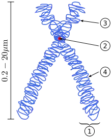 يمتلك الإنسان 46 كروموسومًا في كل خلية جسمية مرتبة على شكل 23 زوجا وكل زوج يتصل ببعضها عند نقطة قرب المركز تسمى القسيم المركزي (centromere)[5] في كل زوج من الكرموسومات يطلق عادة تسمية كروماتيد على القضيب الواحد الذي يتصل مع القضيب الآخر في الزوج، وللسهولة اعتدنا على استعمال مصطلح الكروموسوم لوصف الكروماتيدين المتحدين.