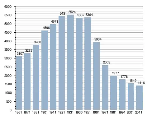 في سنة 1861 بلغ عدد السكان 3٬107 نسمة، وتطور العدد ليصل في سنة 2011 لـ 1٬416 نسمة.