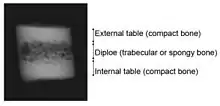 تكون عظام الجمجمة في ثلاث طبقات: الطبقة الصلبة المصمتة الخارجية (الصفيحة الظاهرة)، والنسيج العظمي الرخو بين الصفيحتين العظميتين للجمجمة (طبقة إسفنجية من نخاع العظم الأحمر في الوسط، وطبقة مدمجة داخلية (صفيحة داخلية).[4]