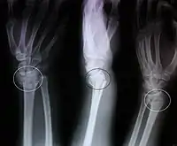 |CitationClass=تم تجاهله (مساعدة) - "Distal Radius Fractures (Broken Wrist)". orthoinfo.aaos.org. March 2013. مؤرشف من الأصل في 02 يوليو 2017. اطلع عليه بتاريخ 12 أكتوبر 2017. الوسيط