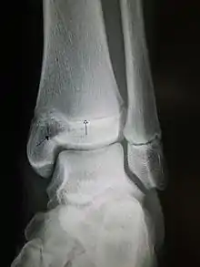 ثلاثة-L: أسفل، الكسر أسفل صفيحة النمو في المشاشة.