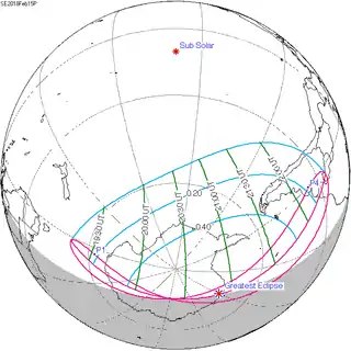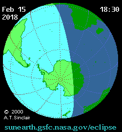 كسوف للشمس الجزئي يوم 15 فبراير 2018. كسوف الشمس الجزئية مرئية في جنوب أمريكا الجنوبية وأنتاركتيكا.
