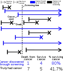 حتى وإن مات الشخص في الحالتين في نفس الوقت، لأننا شخصنا المرض بشكل مبكر مع الفحص، فترة النجاة منذ التشخيص سيكون أطول ; ولكن العمر لم يطل، ووسيتواجد قلق إضافي للمريض لعيشه لفترة أطول مع معرفته بالمرض.