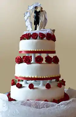 ![]() كعكة زفاف مكونة من ثلاث طبقات مدعمة بأعمدة | |