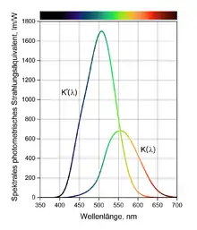 إذن ، تنتمي لطول الموجة هذه مكافيء طيفي قدره 683 لومن/واط. وتشارك طاقات إشعاعية يكون لها طول موجة أخرى بمقادير أقل إلى التدفق الضوئي.