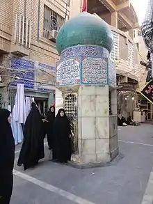 وفي واجهة المقام الجانبية يقع شباك محاط بالكاشي الكربلائي وفوقه كتيبة منه كتب عليها ( بسم الله الرحمن الرحيم : وَفَضَّلَ اللّهُ الْمُجَاهِدِينَ عَلَى الْقَاعِدِينَ أَجْرًا عَظِيمًا) سورة النساء - آية 95. والمقام شباك من البرنز خارج من الواقعة في زقاق الصخني بالقرب من باب العلقمي.، والمعروف ان هذا المقام شيد في أواسط القرن الثالث عشر الهجري على بقايا نهر كان يعرف في حينه بنهر مقبرة العباس (2)، وقد يكون من بقايا نهر العلقمي.
