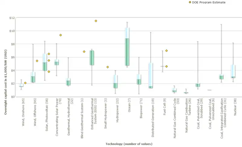 - الكلفة التأسيسية (متضمنةً تكاليف التخلص من النفايات وتكاليف إنهاء الخدمة للمحطات النووية): يظهر الشكل البياني في الأسفل مقارنة للتكاليف التأسيسية لمختلف أنواع محطات الطاقة المنفذة بين عامي 2008 و2012 في الولايات المتحدة الأمريكية.[1]