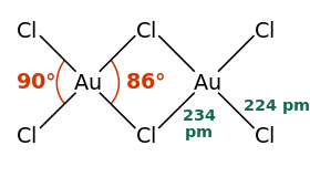 على العكس من بنية كلوريد الألومنيوم رباعية الوجوه، فإن لكلوريد الذهب الثلاثي بنية مربعة مستوية. أي أن ذرتي الكلور الطرفية تكونا على نفس سوية ذرتي الكلور المشكلتين للرابطة الجسرية بين ذرتي الذهب في المتماثر الثنائي.[10]