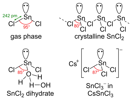 لمركب كلوريد القصدير الثنائي زوج وحيد من الإلكترونات، لذلك يكون الجزيء منحنياً (غير خطي) في الحالة الغازية. أما في الحالة الصلبة فإن كلوريد القصدير الثنائي يشكل سلاسل متصلة ببعضها البعض عن طريق جسور كلورية. أما الشكل المائي من ثنائي الهيدرات فإنه يكون أيضاً على شكل رباعي وجوه، وتكون ذرة الأكسجين من إحدى جزيئتي الماء مرتبطة مباشرة مع ذرة القصدير، أما الأخرى فترتبط بالأولى.