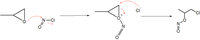 كما يخضع أكسيد البروبيلين إلى تفاعل إضافة إلكتروفيلية مع NOCl ليعطي مشتقات α-كلورونتريتو الألكيل.