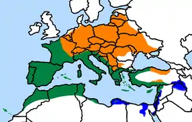 ![]() المدى: برتقالي, صيف; اخضر, طول السنة; ازرق, شتاء | |