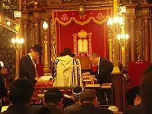 يحاول المعبد أن يكون صدى للهيكل. ومعظم المعابد اليهودية في الوقت الحاضر بُنيت متجهة للقدس. ويوجد حوض في الخارج يستطيع المصلون غسل أيديهم فيه قبل الصلاة، وشكل المعبد في الغالب مستطيل. وتوجد في مقدمة المعبد فجوة تغطيها ستارة (أصبحت دولاباً ثابتاً) هي تابوت لفائف الشريعة الذي تُحفَظ فيه اللفائف، وهي أكثر الأشياء قداسة في المعبد (وتقابل قدس الأقداس في الهيكل القديم). وعادةً ما تُزَّين المعابد في العصر الحديث بنجمة داود ولوحي العهد. وقد كان قارئ التوراة يقف في مكان أكثر انخفاضاً (نسبياً) من أرض المعبد. وفي الوقت الحاضر، انعكس الوضع فصار القارئ يجلس على منصة عالية نسبياً تُسمَّى «بيماه» (أو «الميمار»). وتُقام في المعبد الصلوات اليومية، فبإمكان أي شخص، من الناحية النظرية، أن يؤم المصلين. غير أن من المعتاد أن يؤم المصلين أفراد تلقوا دراسة خاصة للقيام بهذه الوظيفة. وتُقرَأ التوراة في المعبد كل يوم سبت، وفي يومي الاثنين والخميس من كل أسبوع [4]