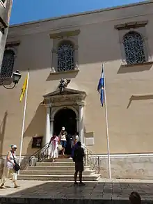 Agios Spyridon's remains were eventually placed in the predecessor of the church that now bears his name in another quarter ... from the Esplanade, the guiding landmark being the extremely tall belfry of the church, the highest on the Ionian Islands.