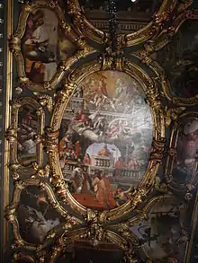 يشبه الجزء الأمامي من حاملة الأيقونات الرخامية الجزء الخارجي من مدخل كنيسة على الطراز الباروكي. سقف الكنيسة مقسم إلى أجزاء تصور مشاهد من حياة القديس سبيريدون ومعجزاته. كان الرسام الأصلي لسقف الكنيسة هو باناجيوتيس دوكساراس الذي رسم تلك الأعمال الفنية في عام 1727. مع مرور الوقت، تعفنت لوحات دوكساراس ومن ثم استُبدِلت بنُسخ رسمها نيكولاوس أسبيوتيس، أحد أفراد عائلة أسبيوتيس في كورفو. إن الأثر الوحيد المتبقي لعمل دوكساراس هو الحدود المذهبة لحاملة الأيقونات.
