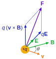 قوة لورنتز تؤثر على جسيم مشحون +q يمر بسرعة v خلال مجال كهرومغناطيسي.