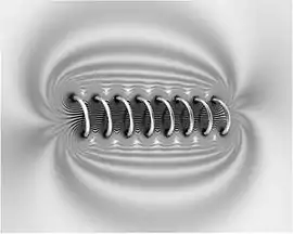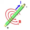 - فمرور تيار كهربائي في سلك يحدث حوله مجالا مغناطيسيا دائريا تكون فيه خطوط المجال في دوائر مغلقة . (الموصل ليس لازما فمجرد مرور جسيمات مشحونة مثل الإلكترونات في الفراغ فهي تحدث حولها مجالا مغناطيسيا، العبرة في الشحنة وفي حركتها .)
