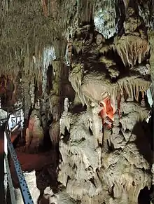 تطور الكهف خلال حقبة الحياة الوسطى (العصر الجوراسي)، وانقسمت الرواسب إلى عدة مستويات طبقية. تشبه التكوينات الصخرية الصبار العملاق أو اللؤلؤ الوردي أو الأعمدة المتينة أو الستائر الرقيقة، وفي العديد من الأماكن تتغذى الأحواض المائية بمواد الهوابط، وتبلغ مساحتها 10400 متر مربع، ويبلغ طول الممرات حوالي 2000 متر مربع، وتبقى درجة الحرارة على مدار العام ثابتة عند 17 درجة مئوية.[2]
