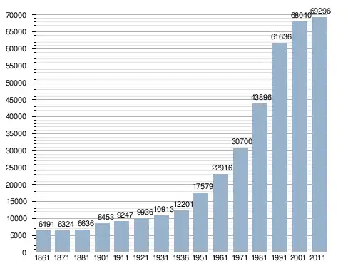 في سنة 1861 بلغ عدد السكان 6٬491 نسمة، وتطور العدد ليصل في سنة 2011 لـ 69٬296 نسمة.