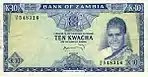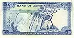 10 كواشا | 1974 | 1974 | صورة الرئيس كينيث كاوندا في الزي القبلي على اليمين، مع شعار زامبيا في الوسط | شلالات فيكتوريا على نهر مببيزي | الرئيس كينيث كاوندا |