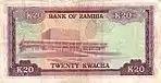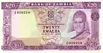 20 كواشا | 1974 | 1974 | صورة الرئيس كينيث كاوندا في الزي القبلي على اليمين، مع شعار زامبيا في الوسط | مبنى الجمعية الوطنية في لوساكا | الرئيس كينيث كاوندا |