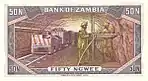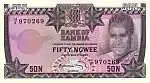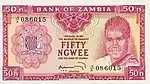 خمسين نيغو | أسود وأرجواني | 1973 | 1973 | صورة الرئيس كينيث كاوندا في الزي القبلي على اليمين. شعار زامبييا في المركز العلوي. صورة عقاب سمك أفريقي يطير أمام الشمس على اليسار. | عمال في منجم النحاس | الرئيس كينيث كاوندا |