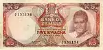 5 كواشا | 1976 | 1980 | صورة الرئيس كينيث كاوندا في الزي القبلي على اليمين. شعار زامبيا في المركز العلوي. | أطفال في النصف والمدرسة على اليسار | الرئيس كينيث كاوندا |