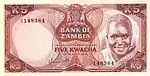 5 كواشا | أحمر بنفسجي | 1973 | 1973 | صورة الرئيس كينيث كاوندا في الزي القبلي على اليمين. شعار زامبيا في المركز العلوي. | أطفال في النصف والمدرسة على اليسار | الرئيس كينيث كاوندا |