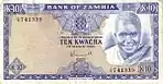 10 كواشا | 1976 | 1980 | صورة الرئيس كينيث كاوندا في الزي القبلي على اليمين. شعار زامبيا في المركز العلوي. | شلالات فيكتوريا على نهر مببيزي | الرئيس كينيث كاوندا |