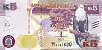 5 كواشا | أزرق | الذكرى الخمسين للاستقلال | شعار زامبيا، النصب التذكاري الوطني للشجرة الكبيرة في كابوي، عقاب سمك أفريقي يجلس على فرع | صور رؤساء زامبيا منذ الاستقلال في عام 1964 وحتى عام 2014، في اتجاه عقارب الساعة من أعلى: كينيث كاوندا وليفي موناوازا ومايكل ساتا وروبيا بانداوفريدريك شيلوبا. والمقر الرئيسي لبنك زامبيا، وتمثال الحرية في لوساكا. | عقاب السمك الأفريقي | 2014 | جيزيكي + ديفرينت |