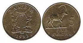 |CitationClass=تم تجاهله (مساعدة) - "Banknote: 1 Kwacha (Zambia) (1973 ND "Birth of the Second Republic" Commemorative Issue) Wor:P-16s". Colnect. الوسيط