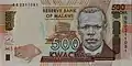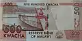 500 | 132×66 ملم | بني وبرتقالي | مقر البنك الاحتياطي في ليلونغوي ؛ جون تشيلبوي [الإنجليزية] | سد مولونجوزي في زومبا ؛ حنفية ماء | |