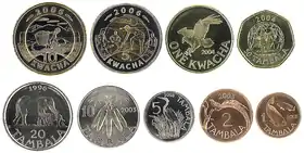 | العملات المعدنية | 1، 5، 10 كواشا وبندرة 1، 2، 5، 10، 20، 50 تامبالا | |||