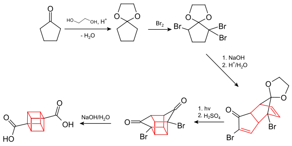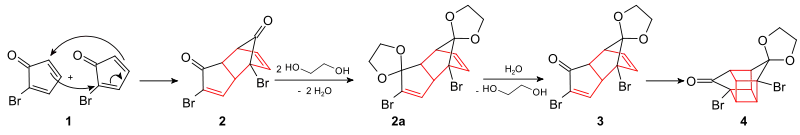 في الخطوة الأولى من تفاعل تحضير الكوبان تجري عملية ديمرة لمركب 2-بروم حلقي البنتاديينون من خلال تفاعل ديلز-ألدر للحصول على الديمر (2)، ثم تتم حماية مجموعتي الكربونيل باستخدام مركب غليكول الإيثيلين (2a). بعد ذلك وبشكل انتقائي تتم حلمهة مجموعة الأسيتال الداخلية بحيث يتشكل المركب (3)، والذي بدوره يخضع إلى عملية إضافة حلقية كيميائية ضوئية [2+2] ضمن الجزيء نفسه بحيث نحصل على شكل الكيتون البرومي (4):