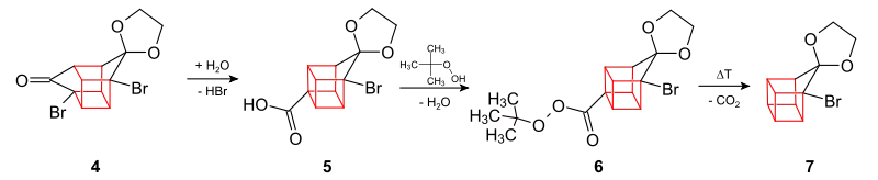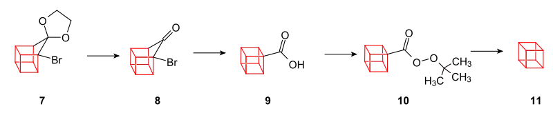 بعد ذلك في خطوة تالية تتم حلمهة مجموعة الأسيتال المتبقية بحيث تحصل على الكيتون البرومي (8)، والذي يجري عليه تفاعل إعادة ترتيب فافورسكي مرة أخرى للحصول على الحمضض الكربوكسيلي (9)، ومن ثم على إستر حمض بيروكسي (10)، والذي يعالج حرارياً للحصول على مركب الكوبان المطلوب (11):