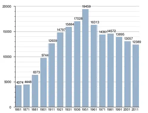 في سنة 1861 بلغ عدد السكان 4٬374 نسمة، وتطور العدد ليصل في سنة 2011 لـ 12٬389 نسمة.